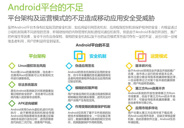 互联网+时代的到来,手机网民占全国网民的95%以上。热门行业Top10的移动应用基本存在高危漏洞,移动应用市场上89%的热门应用存在仿冒。在严峻安全形势下,国家发布了《网络安全法》、《移动互联网应用程序信息服务管理规定》等对网络应用的建设者进行责任划分。